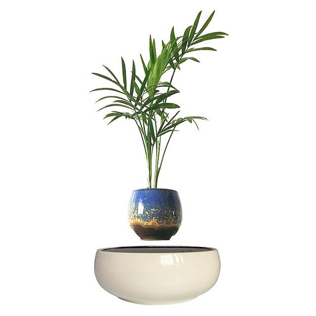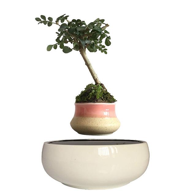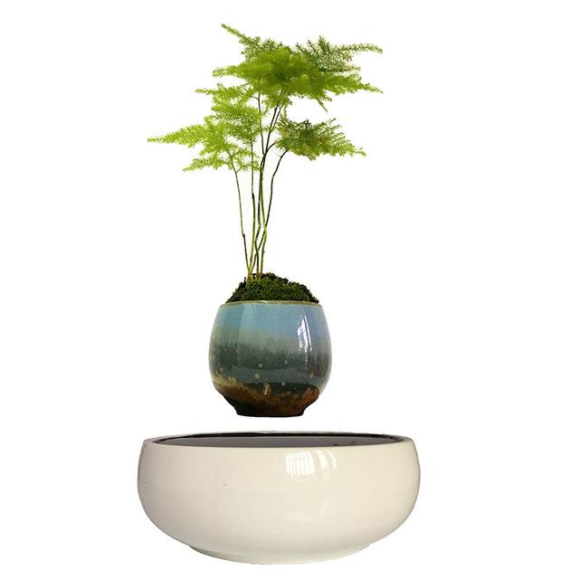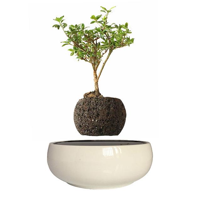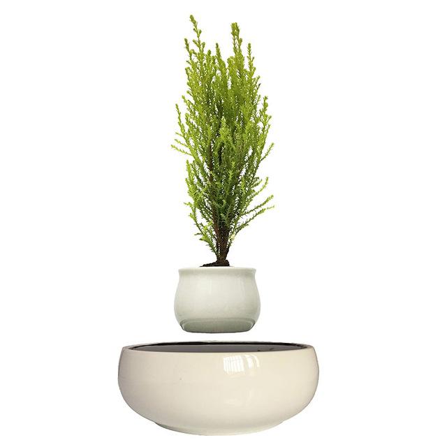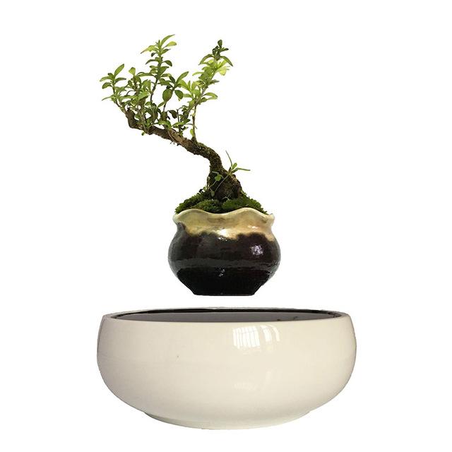 The Air Bonsai plant floats about 0.8 inches off the pot's base, using the negative reaction of two opposing poles of the magnet, pushing away from each other.